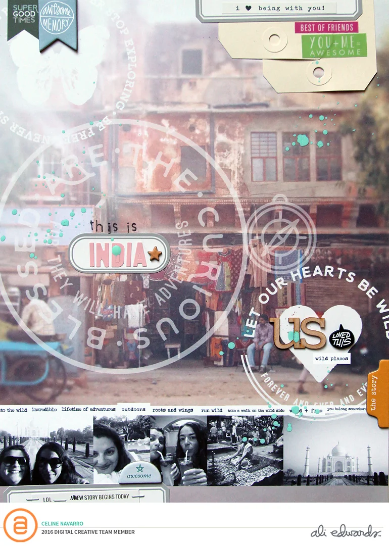 For this one, I worked on a 8,5x11" photo and added some WILD Story Kit digital stamps to my background, playing with the opacity. I then printed on a thick cardstock and added stickers and other chipboards.