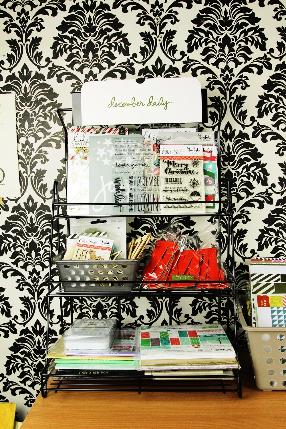 I found this little little metal shelf at a flea market downtown and it is perfect to hold my December Daily products. I gathered the products I got from my kits but also other products I plan on using throughout my album, and that are not necessarily from any kit :
